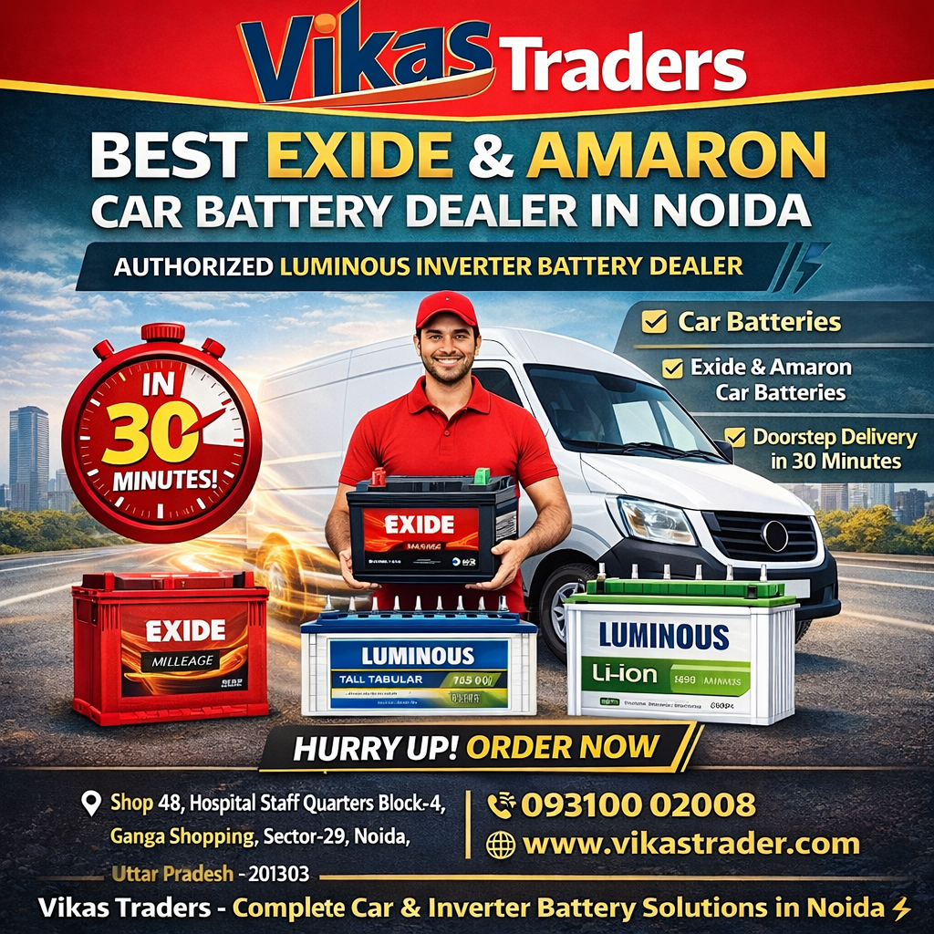 Vikas Traders offers car battery sales, inverter battery sales, battery installation, home delivery, battery replacement, and jump-start support in Noida and Greater Noida.